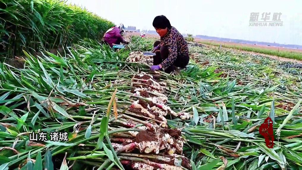 近日,山东多地生姜陆续成熟迎来丰收。在枣庄市市中区税郭镇,一堆堆刚收获的生姜摆满了田间地头,个个体态饱满、色泽鲜艳。村民们忙着挖姜、剪姜秆,田间地头一派繁忙的景象。在诸城市,新鲜的生姜香味伴随着泥土的芬芳扑面而来,姜农们正抢抓农时收获大姜,脸上洋溢着丰收的喜悦。
