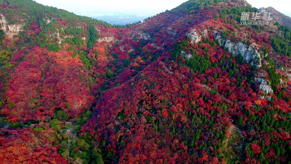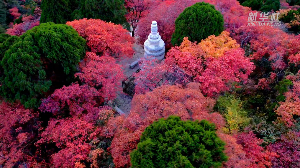 深秋时节,山东临朐石门坊景区层林尽染,映红天际的枫叶,摇曳在树枝,烂漫在深秋。斑斓的色彩点缀在蓝天、白云、山川之间,构成一幅醉人的金秋画卷。