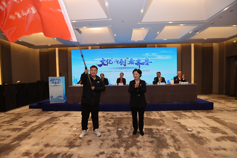 山东省委统战部副部长张静为网络名人采风团授旗。张超摄
