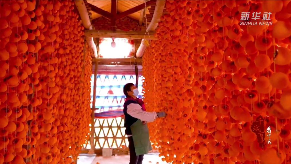 小雪时节,山东省临朐县隐士村的柿子已采摘完毕并进入晾晒阶段。进入晾晒房仿佛被一片片火红的“柿子瀑布”包围,饱满的柿子被高高挂起,空气中弥漫着诱人的柿香。金黄半透明的“流心柿饼”,外皮韧而不硬,咬上一口,香甜软糯,让人欲罢不能。