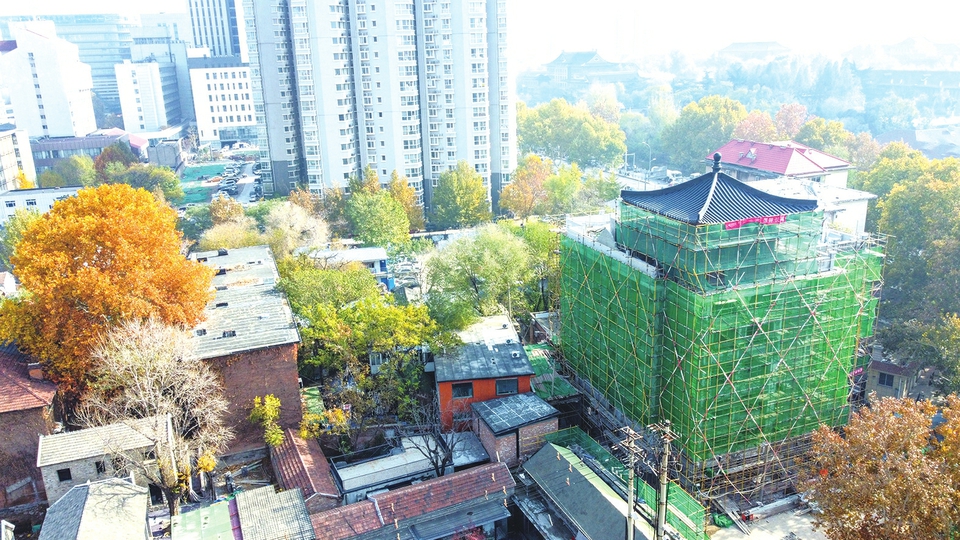 从今年9月开始,施工人员对老居民楼进行整体加固改造,在楼顶新建起一座中式建筑风格的四角攒尖顶,古色古香的造型与西侧的古建筑群风格实现了统一。(王锋摄)