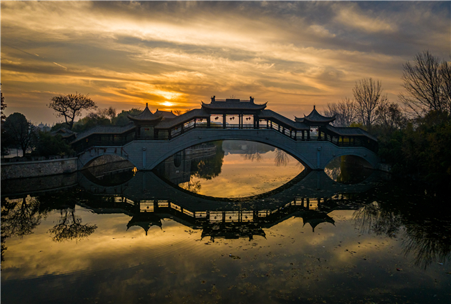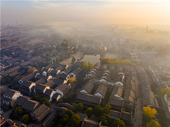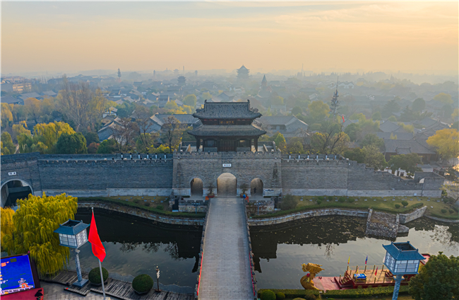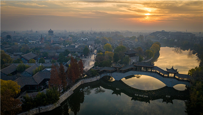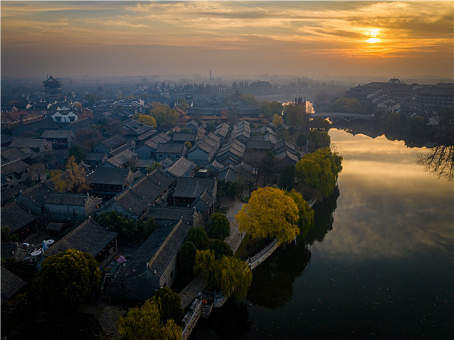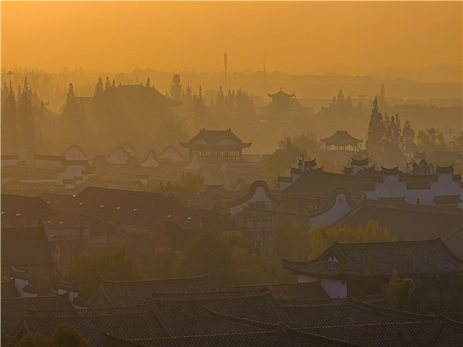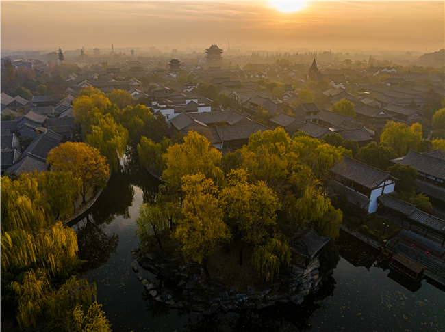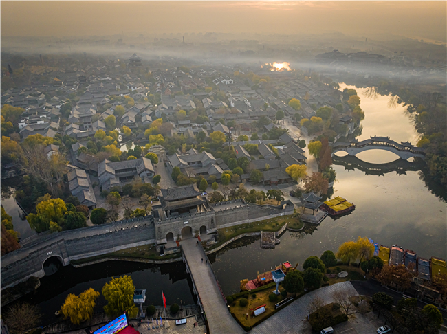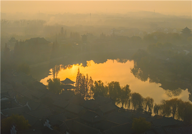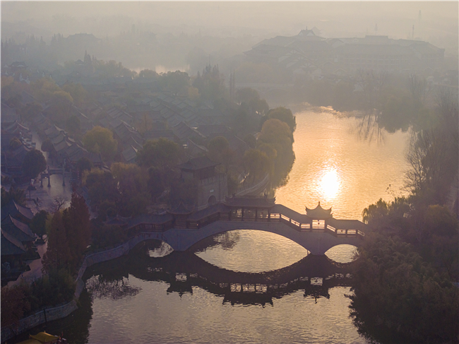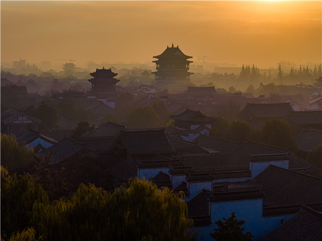 冬日的清晨,太阳刚刚升起,台儿庄古城仿佛被一层金色的光辉笼罩。