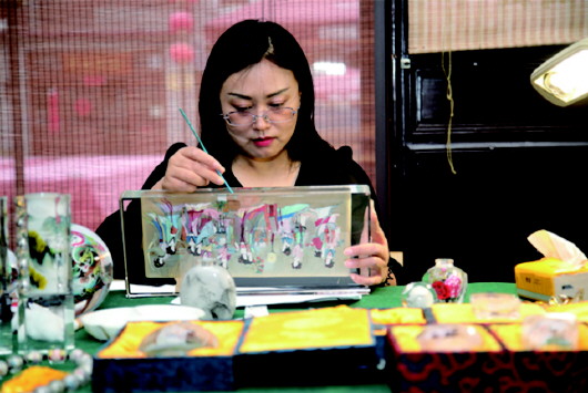 特别是球顶图案的绘制,需要使用稳定性差的长笔杆,这对绘制者提出了更高的要求。同时,创作玻璃内画也不能一气呵成,每一处细节至少要上两三层色彩,才会让作品更灵动。”谈及创作中的难题,马金霞说道。