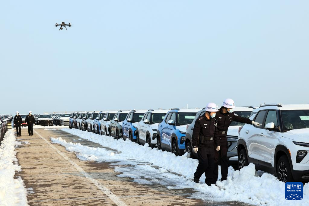 12月27日,在山东港口烟台港,山东出入境边防检查总站烟台边检站民警对等待装船的出口商品车进行巡查巡检。