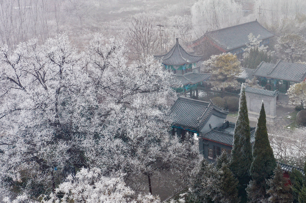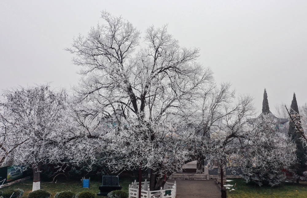2023年12月29日,山东省邹平市长山镇一范仲淹教学点雾凇景观。