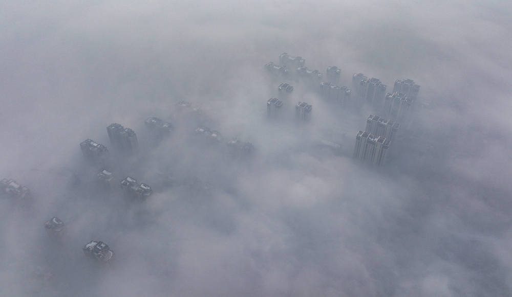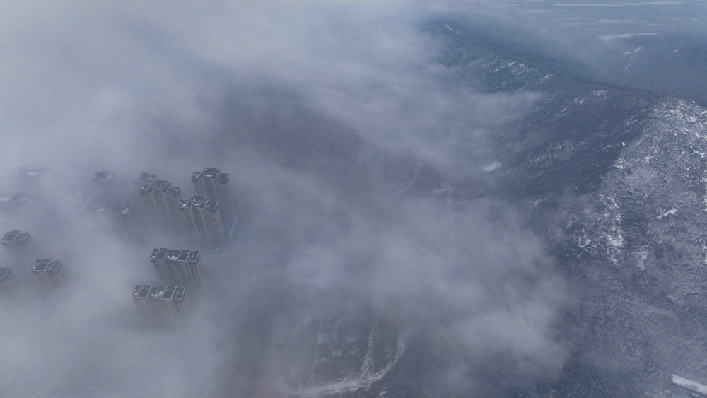 近日,山东省邹平市连续出现雾天,雾气在城区、山间飘动,山尖和楼顶时隐时现,树枝上凝结雾凇,形成了特有的雾景,增添了冬日情趣。(董乃德 张统琦)