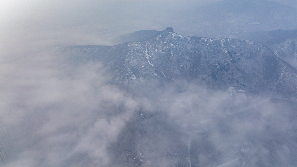 2023年12月29日,山东省邹平市黄山街道印台山附近航拍冬雾景观。