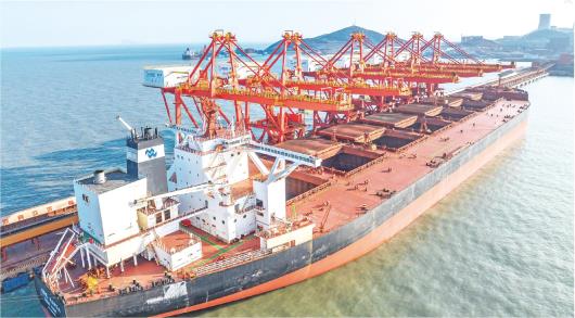 1月1日,一艘矿船在山东港口烟台港西港40万吨级矿石码头卸载货物。新年第一天,山东港口烟台港迎来“开门红”,各类大型货轮密集靠泊,生产作业紧张有序,一派繁忙景象。