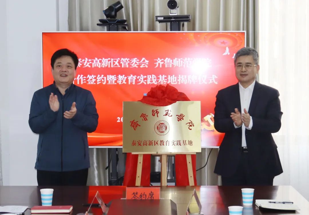 仪式上,泰安高新区和齐鲁师范学院相关负责人签订了基础教育合作协议;市教育局和齐鲁师范学院相关负责人为齐鲁师范学院泰安高新区教育实践基地揭牌。