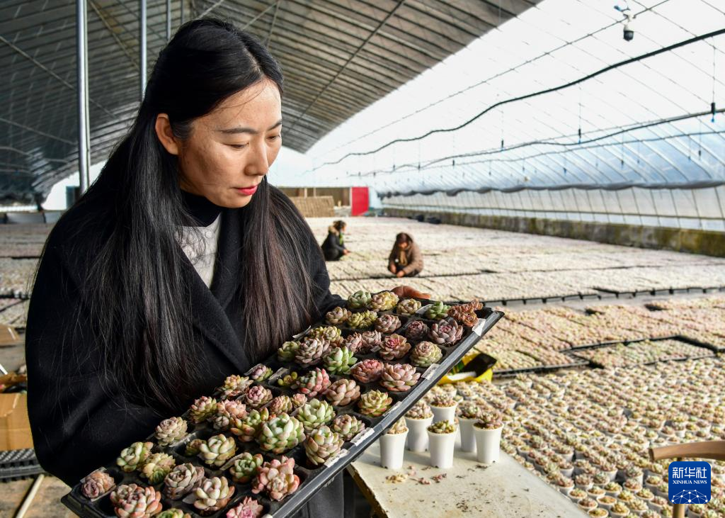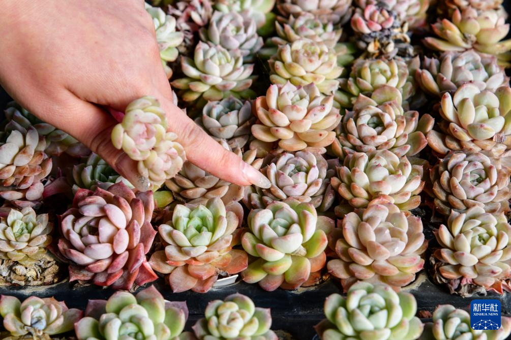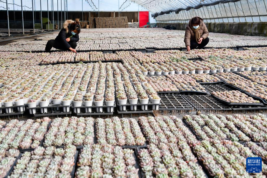 近年来,济南市长清区文昌街道水泉村引入龙头企业,大力发展多肉植物特色种植。目前,水泉村已形成以新品种研发、繁育、推广、销售于一体的综合性农业示范基地,带动村民创富增收。新华社记者 朱峥 摄