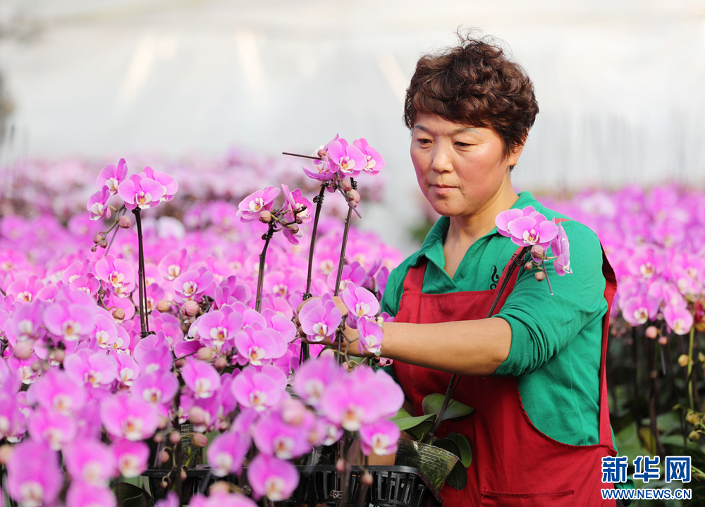 在位于山东省青岛市即墨区灵山街道的青岛百亿绿洲花卉种植基地,花农在给购买鲜花的市民挑选蝴蝶兰。新华网发(张进刚 摄)