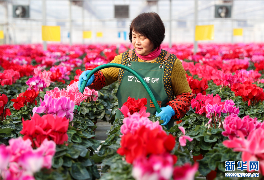 在位于山东省青岛市即墨区灵山街道的青岛百亿绿洲花卉种植基地,花农准备给花卉浇水。新华网发(张进刚 摄)