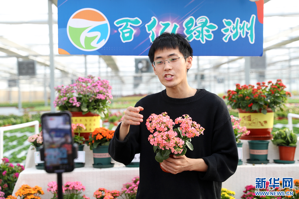 一名网络主播通过线上销售花卉。新华网发(张进刚 摄)