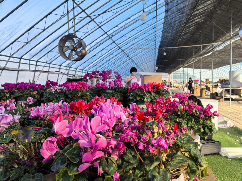 走出居住的小屋,步入宽敞、明亮的温室大棚,棚内密密匝匝地摆放着蝴蝶兰、仙客来、小丽花等年宵花。每走几步,李有昊就要和正在打包、整理花卉的大姐交代几句,忙得不亦乐乎。