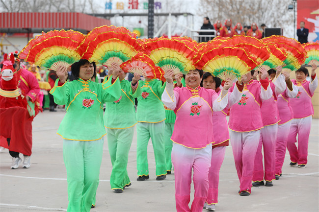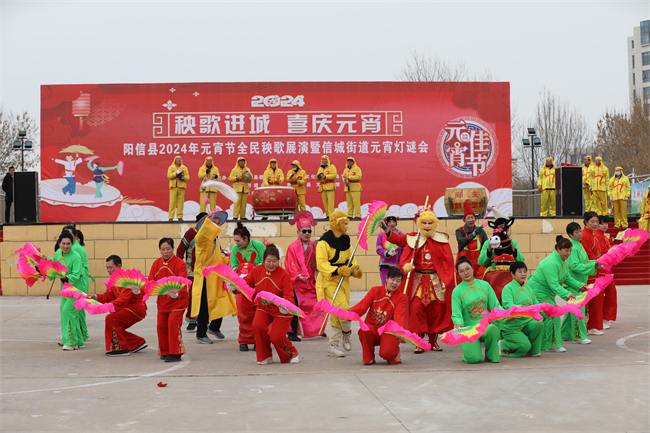 秧歌表演展魅力,欢天喜地闹元宵。2月24日,来自阳信的15秧农民秧歌队,500多名农民演员,分别在梨园公园和全民体育场进行秧歌表演。用激情豪迈的舞姿,表达对新时代美好生活的向往,弘扬中华民族优秀的非遗文化。