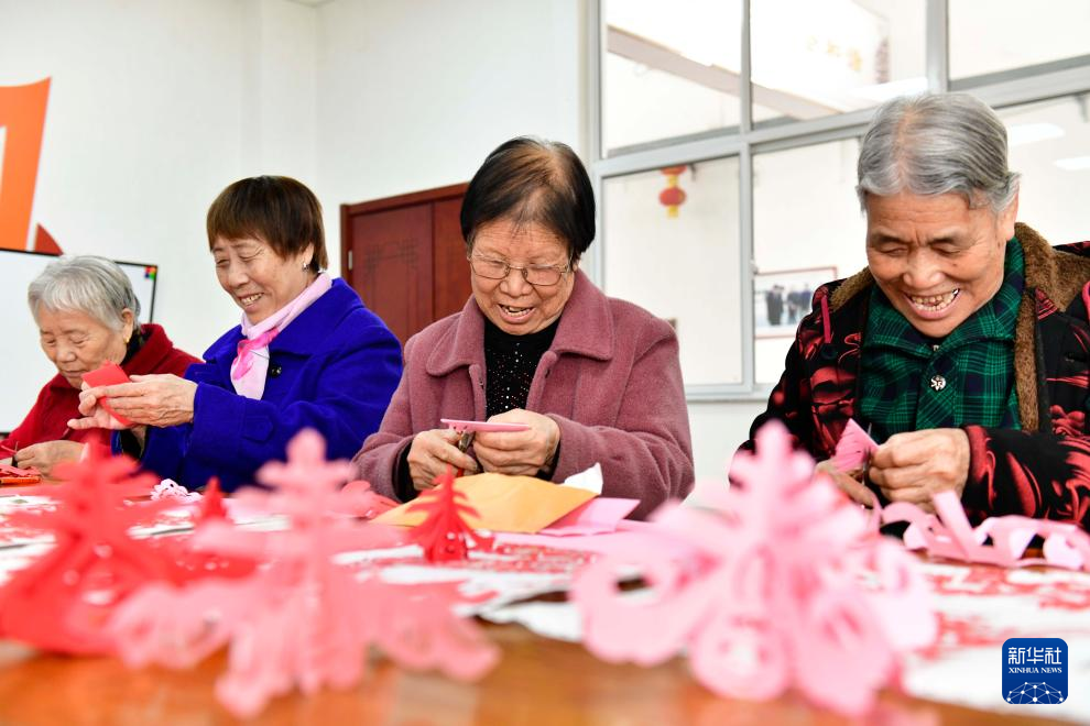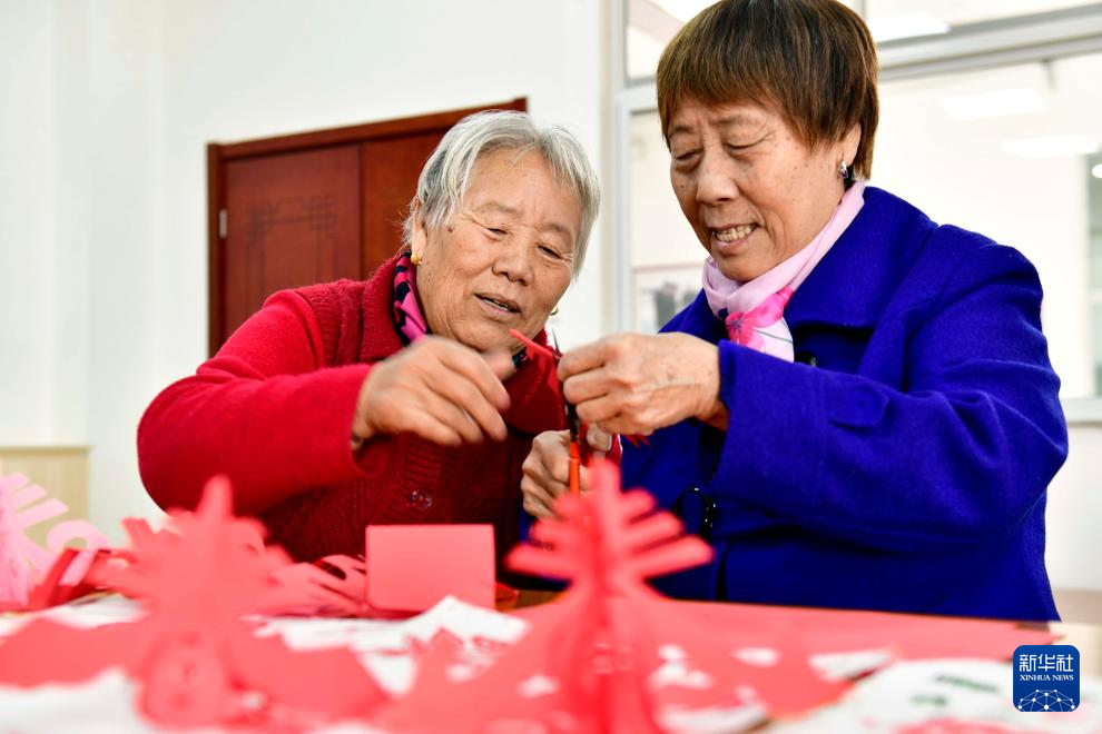 3月2日,在滨州市博兴县博华老年公寓文体活动室,老人们在剪纸。新华社记者 郭绪雷 摄