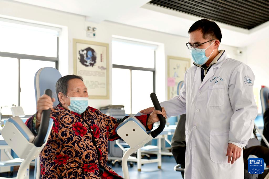 3月2日,在滨州市博兴县博华老年公寓,医护人员指导老人进行康复训练。新华社记者 郭绪雷 摄