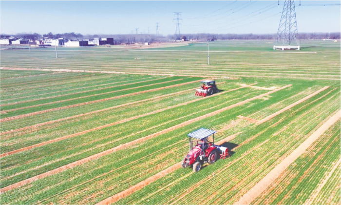 一年之计在于春,一年好景在春耕。连日来,济南市春耕备耕工作有序展开,各区县(功能区)积极推进农资储备、农机服务、田间管理等,保障春季农业生产不误农时,为粮食稳产增收打下坚实基础。图为长清区的高标准农田里,农用机械正在施肥。