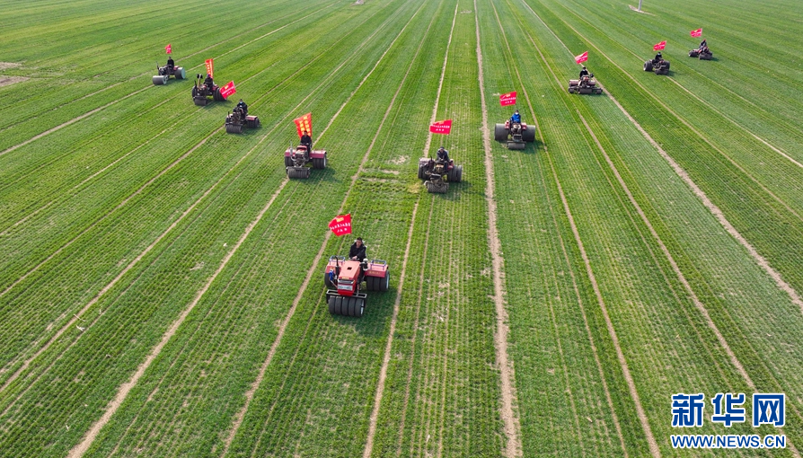 3月13日,山东省邹平市明集镇农业发展联合社农民在对明集村高标准农田进行麦苗镇压作业。新华网发(董乃德 摄)