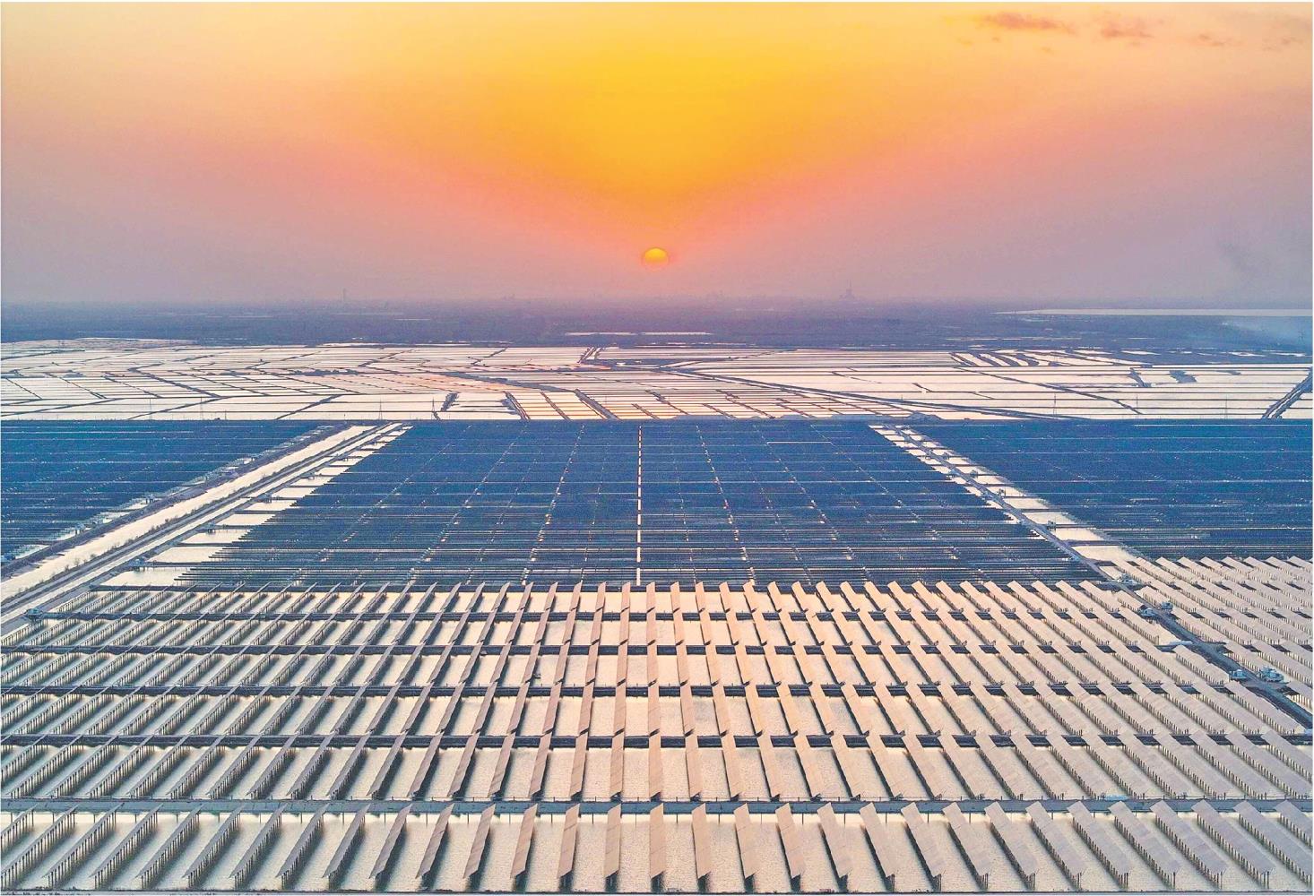 目前,该项目已全部并网发电,每年可提供清洁电量11.21亿千瓦时,节约标煤37.92万吨,减少二氧化碳排放量约90.2万吨。当地还推进渔光互补等复合开发模式,将盐碱滩涂地打造为光伏渔业、文旅观光、乡村振兴等多种产业融合的综合型示范园区。