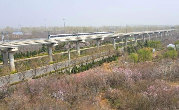 3月28日,济南轨交1号线列车驶出赵营站,融入了车站周边花红柳绿的景色之中。仲春时节,济南轨交1号线站点周边春意盎然,迎来了一年之内最美的时刻。