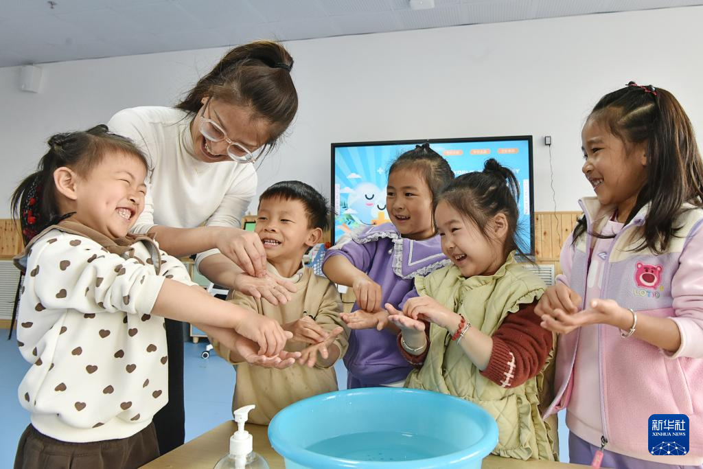 4月7日,山东省高密市凤鸣实验幼儿园小朋友在老师的指导下学习正确的洗手方法。