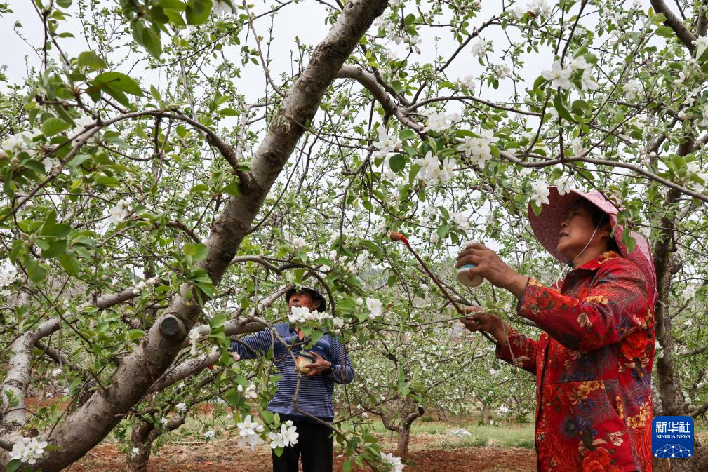 4月10日,沂源县西里镇张家泉村果农在给苹果树授粉。新华社记者 朱峥 摄