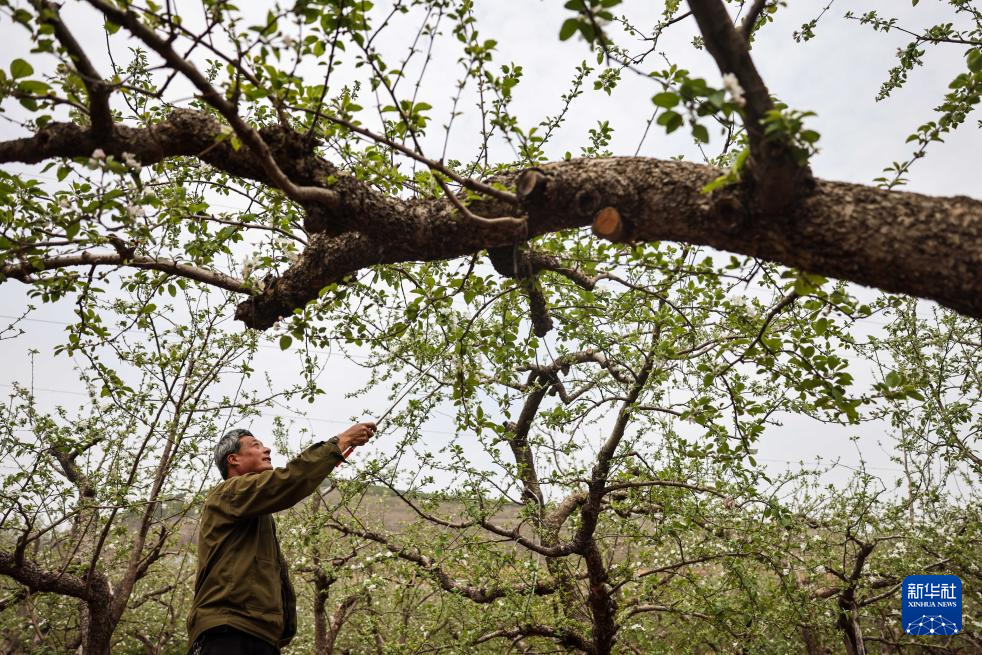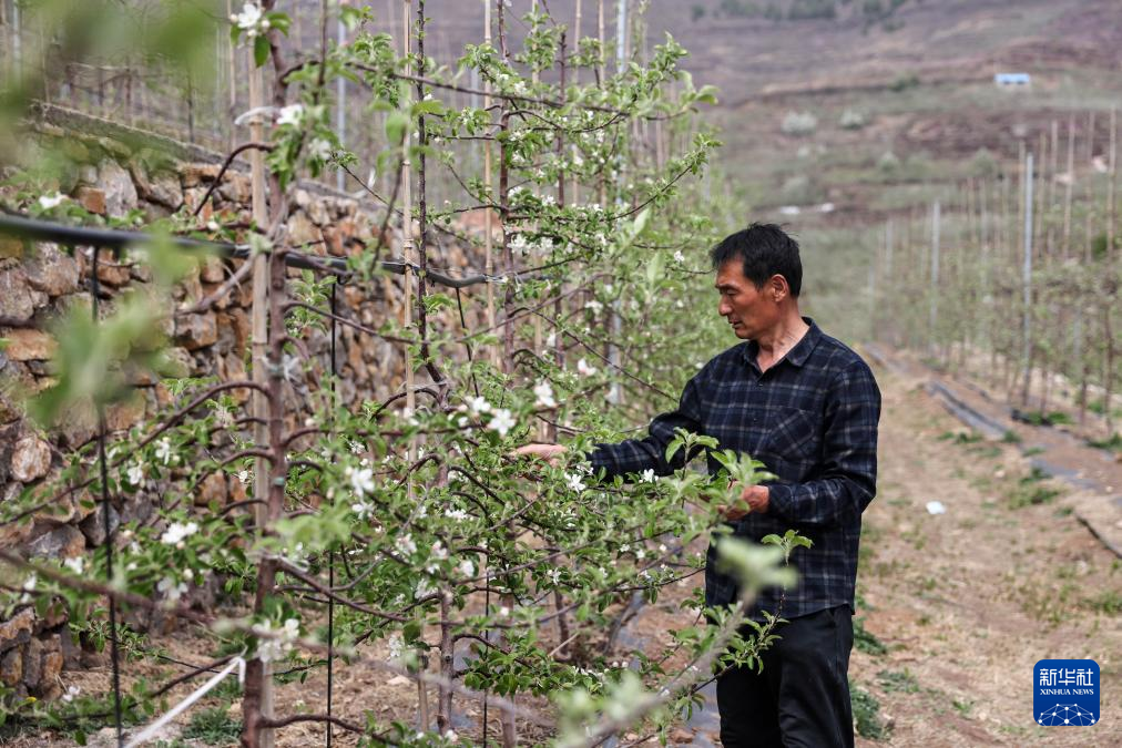 4月10日,果农在西里镇红源新村山地现代栽培园内管护苹果树。新华社记者 朱峥 摄