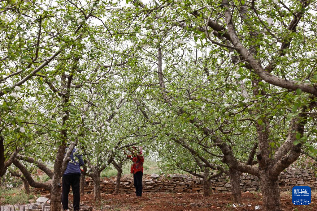 4月10日,沂源县西里镇张家泉村果农左孝英(右)在给苹果树授粉。新华社记者 朱峥 摄