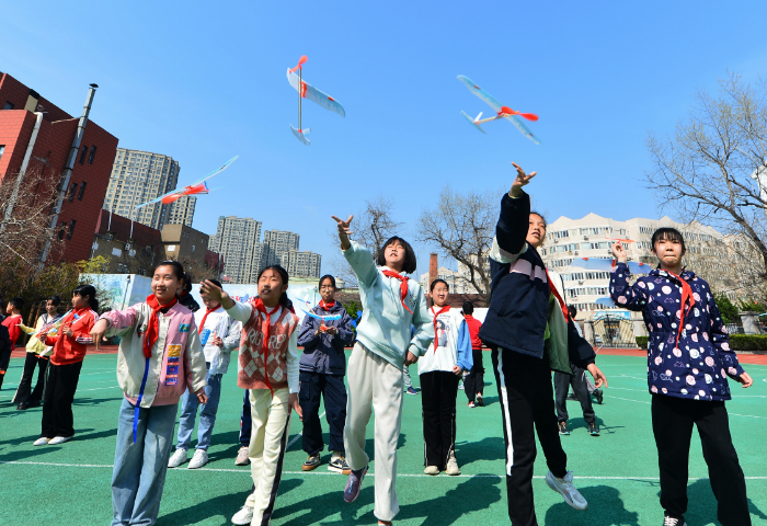 4月11日,在山东省青岛市市北区普集路小学开展的校园科技节活动上,学生们在操场上放飞滑翔机。(王海滨 摄)