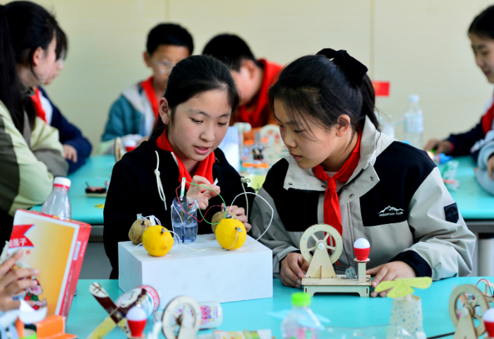 4月11日,在山东省青岛市市北区普集路小学开展的校园科技节活动上,两名学生在调试果蔬发电装置。(王海滨 摄)