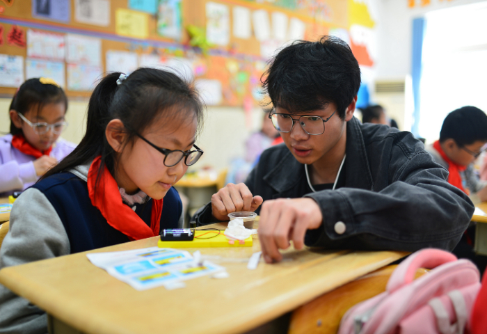 4月11日,在山东省青岛市市北区普集路小学开展的校园科技节活动上,老师在指导学生调试下雨报警器。(王海滨 摄)