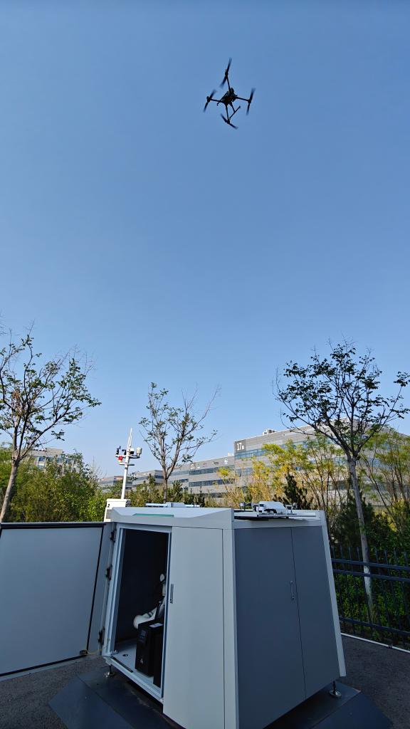 “嗡”的一声,一架无人机腾空而起。笔直爬升几十米后,无人机开始按照预设路线飞行。地面控制站的大屏幕上,显示着无人机多个摄像头回传的实时影像。地面上的人员、车辆,无论动静行止,都被无人机识别框定。完成既定路线后,无人机又自主降落至地面机巢充电待命。