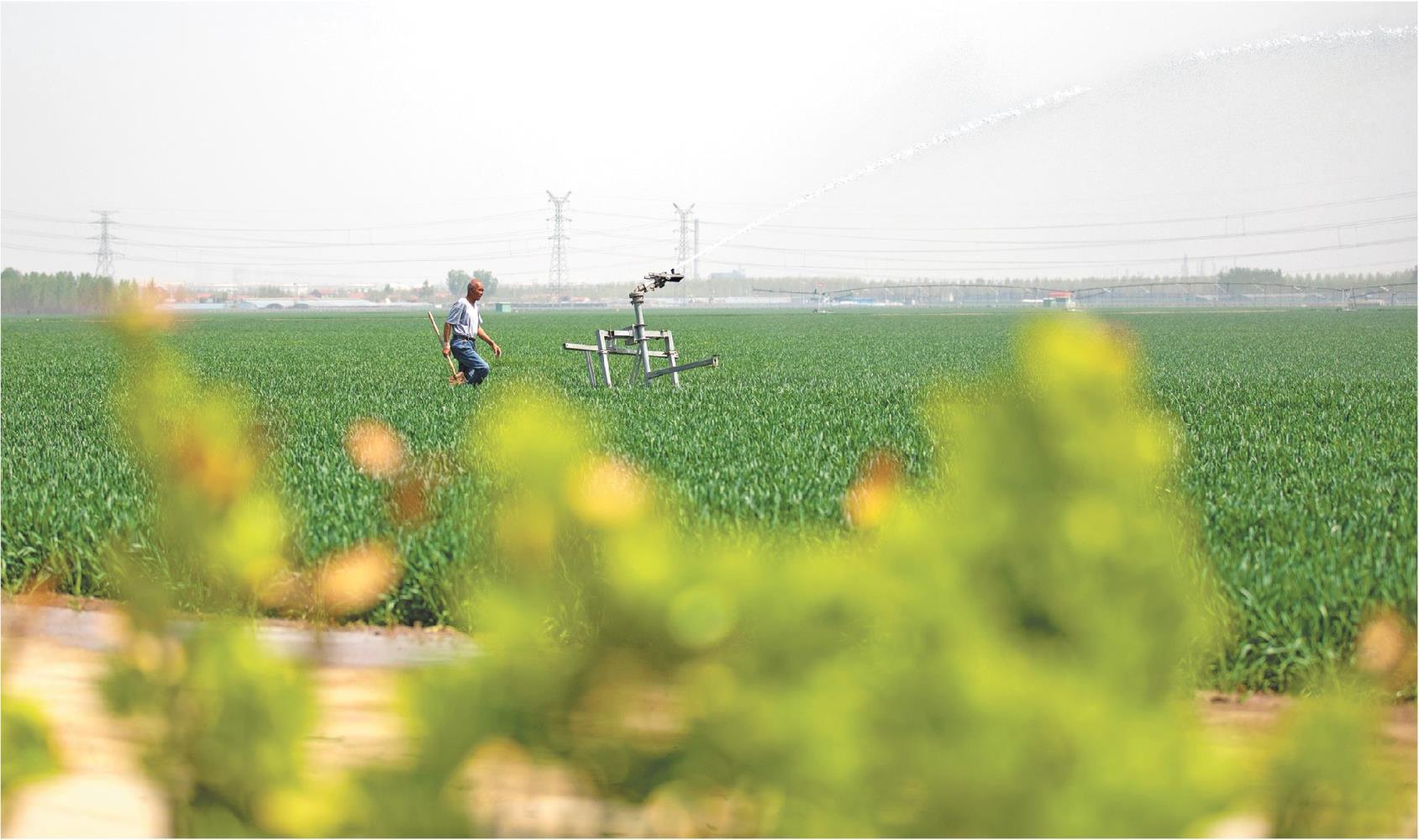 4月17日,在山东省广饶县李鹊镇瀚翔家庭农场的麦田里,农民正在用喷灌机浇地。