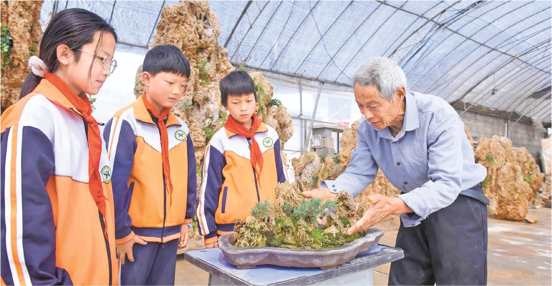 4月11日,山东省枣庄市山亭区水泉镇兴国希望小学学生在聆听“上水石盆景”非遗传承人李景民讲解奇石盆景雕刻技艺。