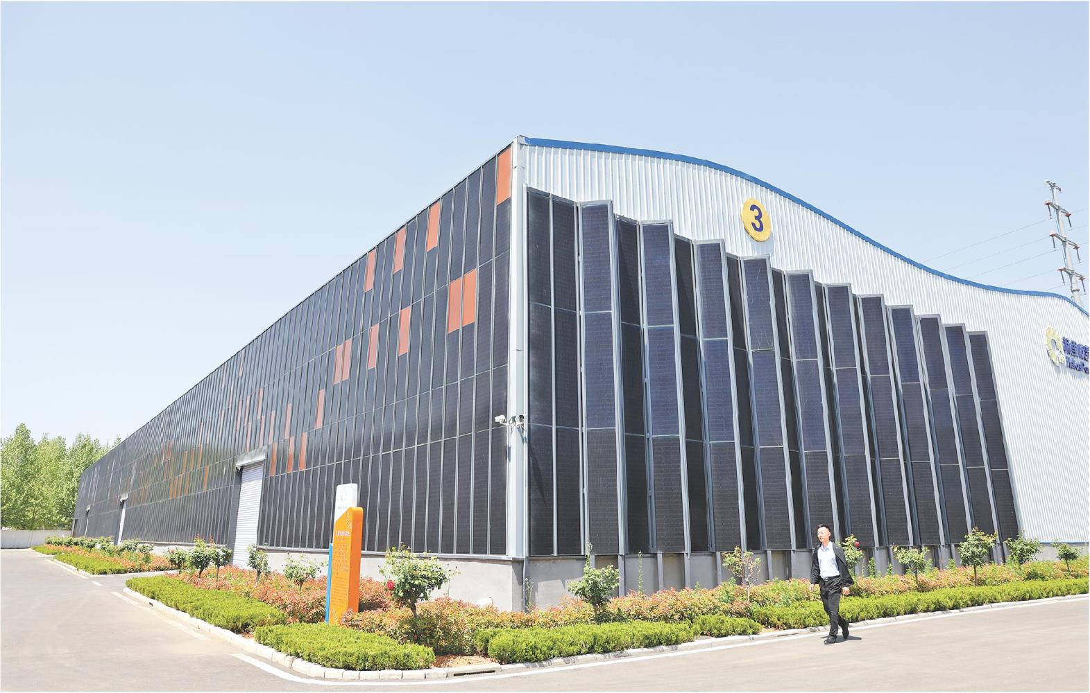 4月24日,在山东省肥城市的赫里欧新能源(肥城)有限公司内,厂房的顶部和侧立面上覆盖着光伏瓦,可以在阳光的照射下发电,深色的光伏瓦像是给厂房穿上了会发电的“外衣”。