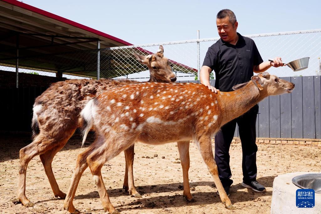 4月27日,在惠民县姜楼镇鹿丰养殖场,工作人员在喂梅花鹿。