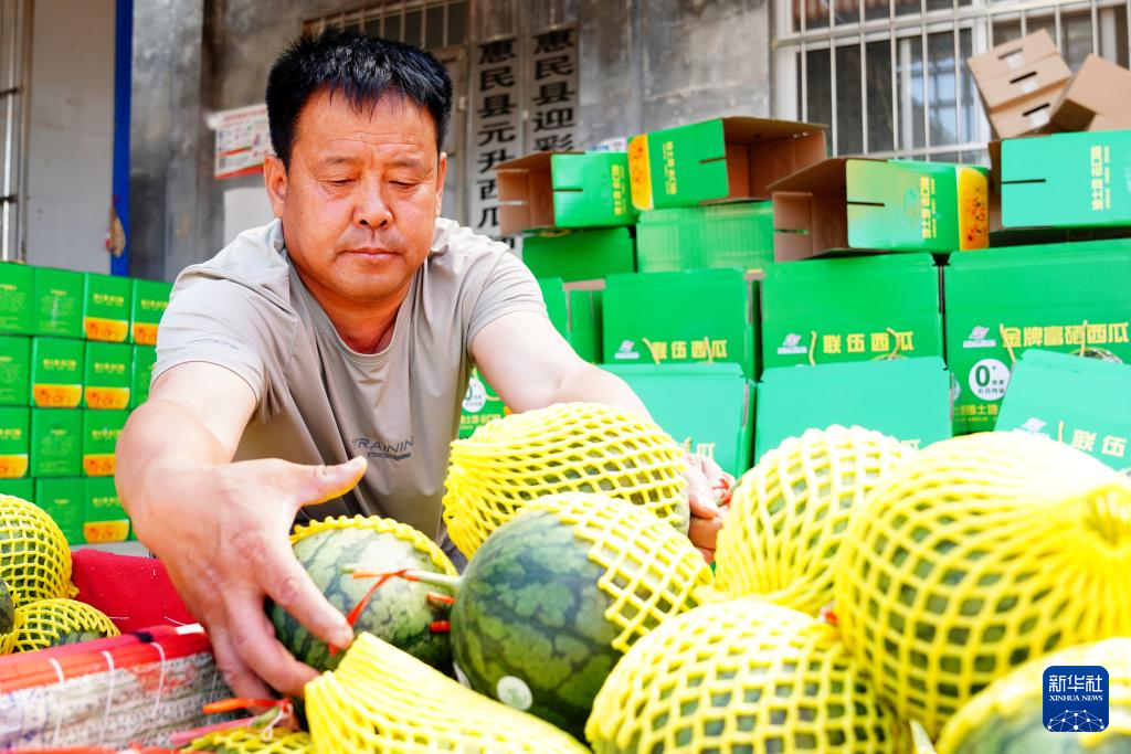 4月27日,在惠民县姜楼镇元升西瓜合作社富硒西瓜种植基地,瓜农将西瓜装箱。