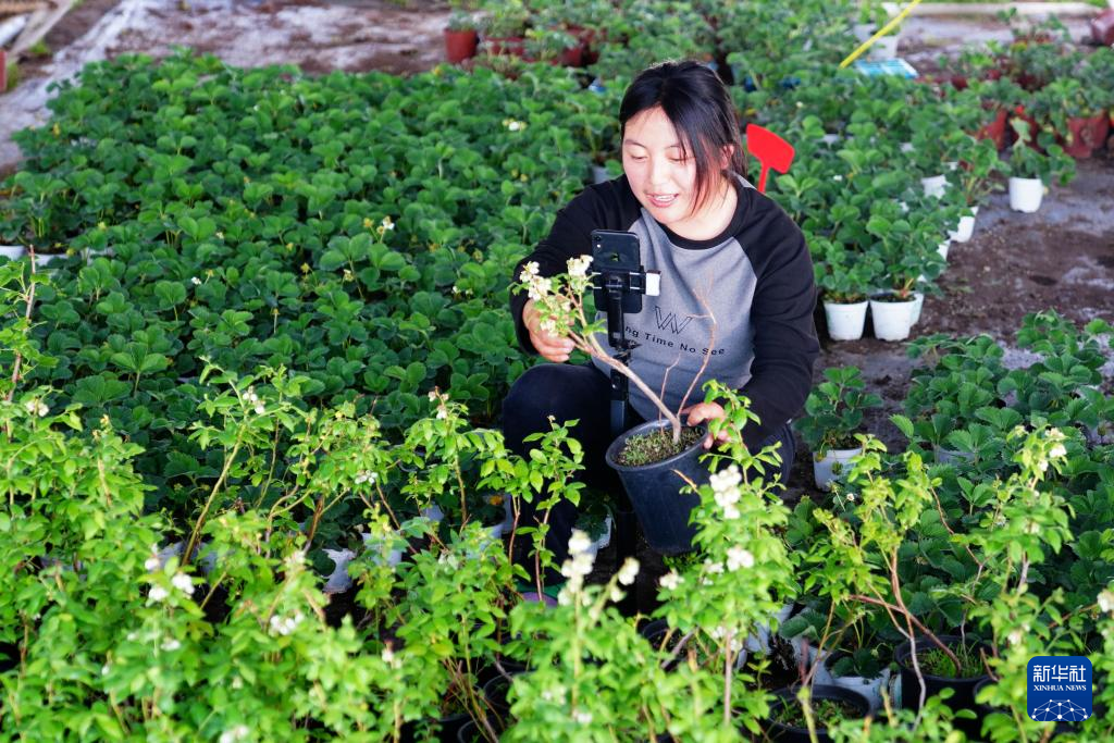 4月27日,在惠民县姜楼镇立冉果蔬种植合作社,工作人员在直播卖蓝莓苗。