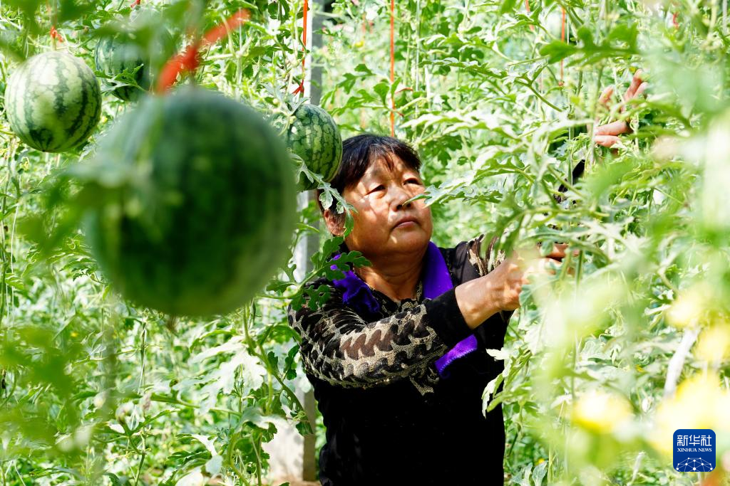 4月27日,在惠民县姜楼镇元升西瓜合作社富硒西瓜种植基地,瓜农在管护西瓜。