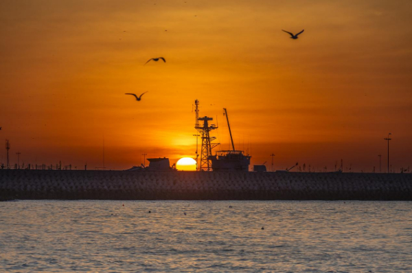 火红的太阳从海平面渐渐升起,染红天边。单英 摄