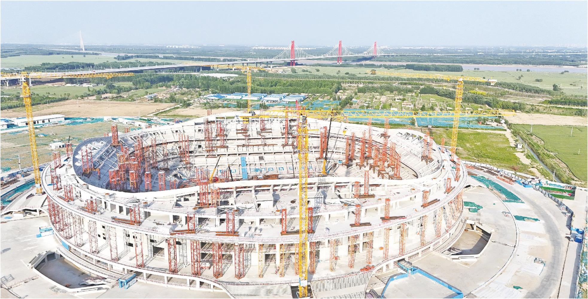 济南黄河体育中心位于起步区崔寨南片区,总体布局为“一场两馆”。其中,专业足球场总建筑面积19.7万平方米,是全省唯一拥有6万座席的专业足球场,达到举办世俱杯、亚洲杯等国际足联A级赛事及国内大型赛事标准。目前主体结构、竖向钢结构已全部完成,正在进行二次结构施工和屋盖钢结构深化设计终审工作。