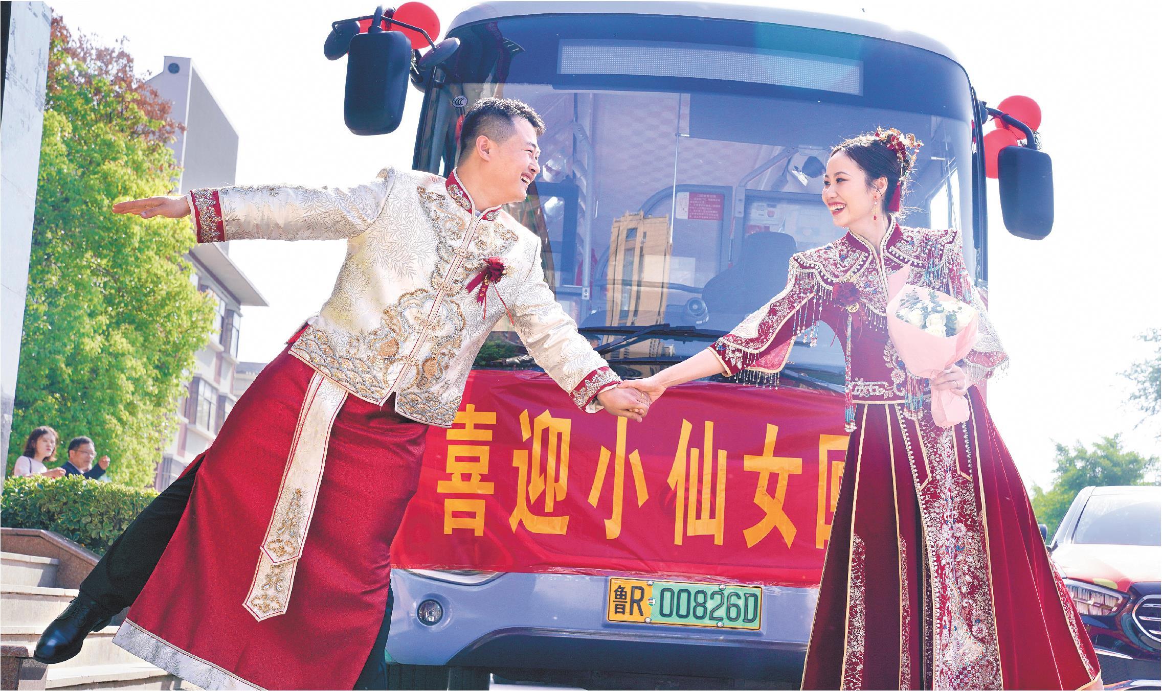 车厢挂满欢庆的喜字和五彩缤纷的丝带,车前部是醒目的横幅“喜迎小仙女回家”,普通的公交车“摇身一变”成为新人的“幸福婚车”。日前,山东郓城小伙祝令润在团县委的组织操办下,举行了一场公交车婚礼,以实际行动践行移风易俗,为爱“减负”。