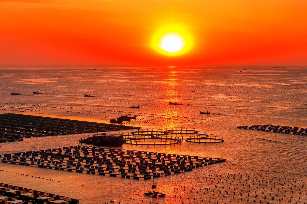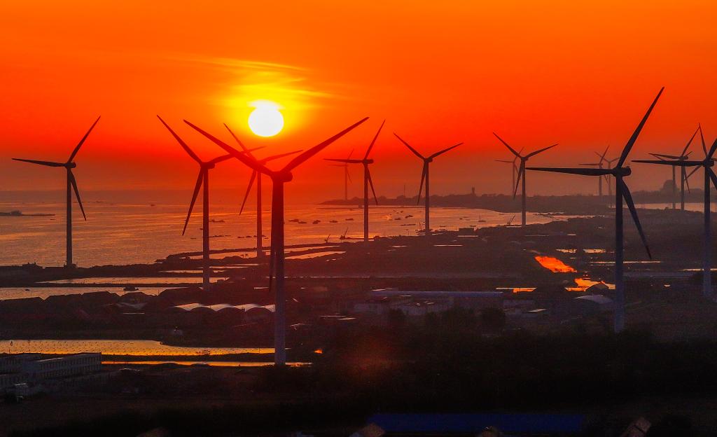 2024年5月27日,晨曦中的山东省荣成市石岛管理区桑沟湾国家级海洋牧场,风力发电机组在运转工作,与日出、大海、薄雾、渔村相映成景,构成一幅绚丽多姿的生态画卷。