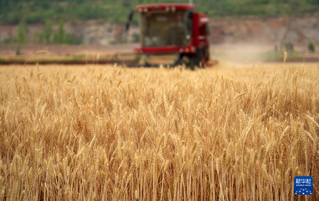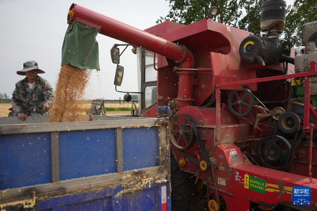 5月29日,在山东省滕州市东沙河街道,农机手驾驶收割机收割小麦。