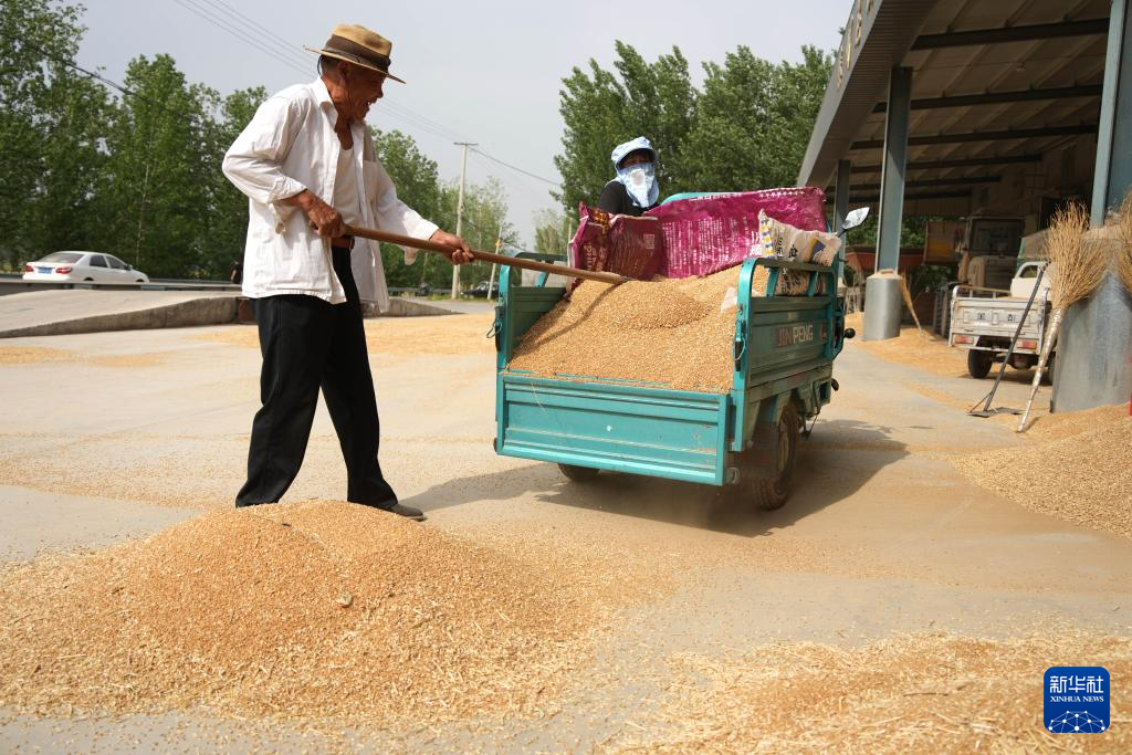 5月29日,在山东省滕州市东沙河街道,村民在晾晒收获的小麦。