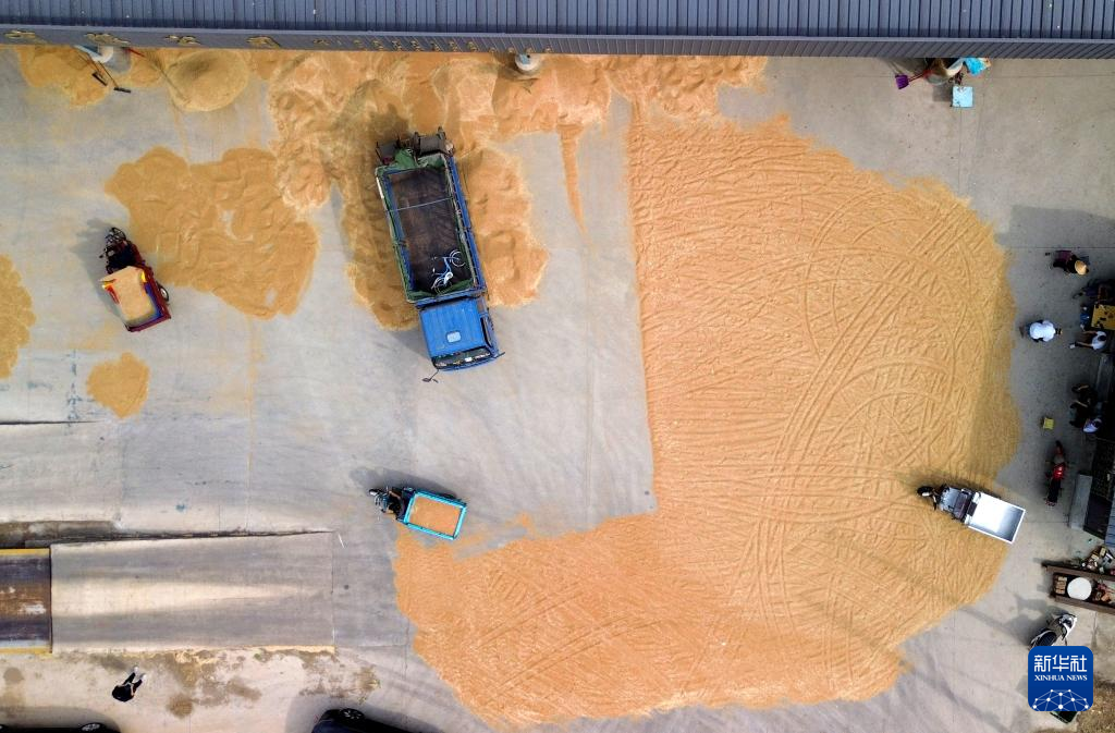 5月29日,在山东省滕州市大坞镇,村民在晾晒刚收获的小麦(无人机照片)。
