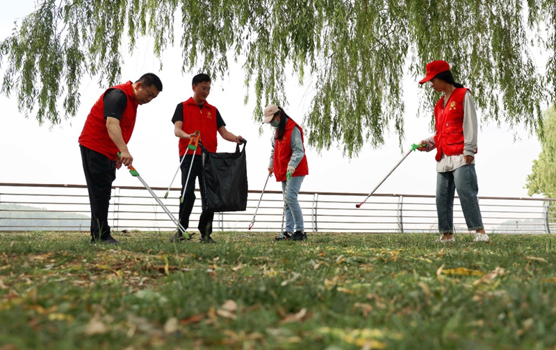6月4日,山东省滨州市的党员志愿者在黄河边捡拾垃圾。