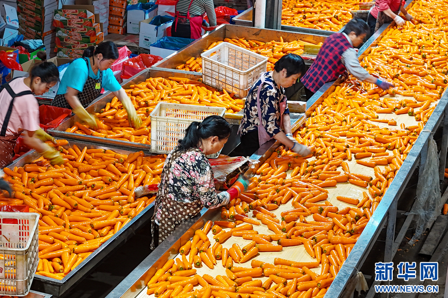 在山东莱西市店埠镇西张格庄专业合作社,村民们在清洗和分装胡萝卜。新华网发(张进刚 摄)