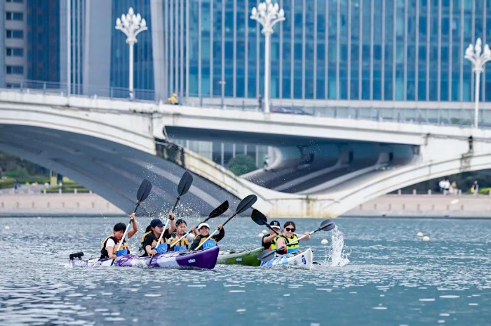 皮划艇爱好者们在海面上激情比赛。刘晶 摄